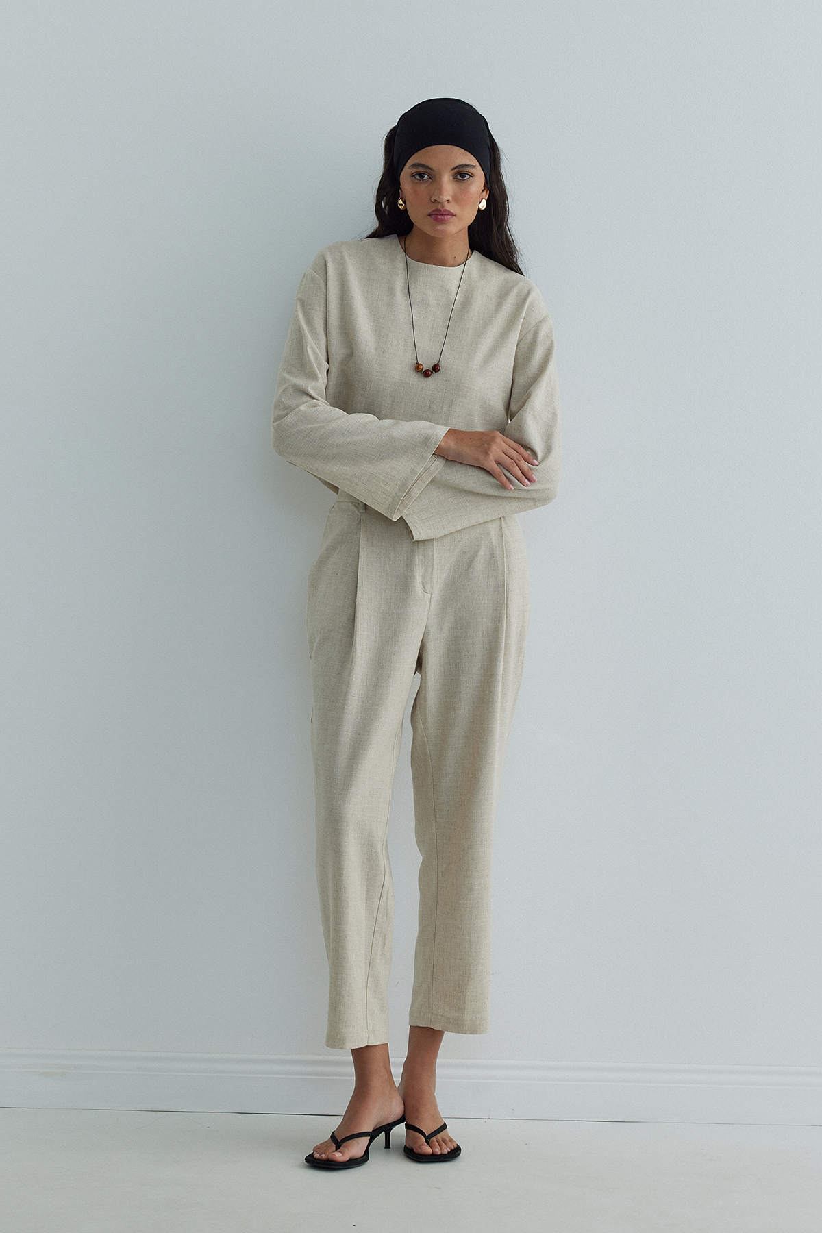 The Isla Pants highlight comfort with their carrot cut and breathable linen fabric, ensuring all-day ease. The pleat detail on the front lends a long and elegant look to your legs. Pair it with the Mussel Crop Linen Blouse to complete your look.