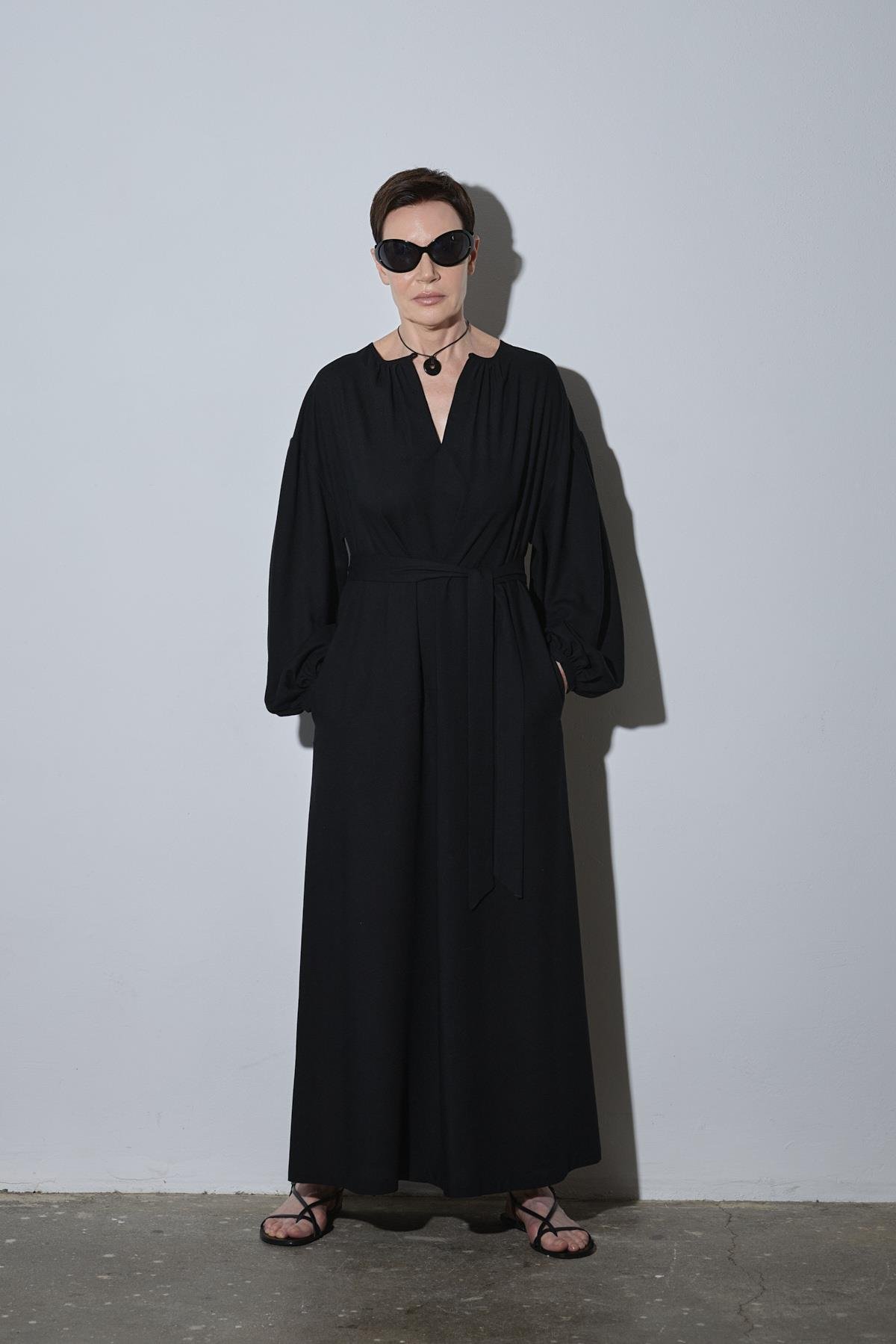 Meggie Elbise, balon kol detayı ve aynı kumaştan üretilen kuşağıyla vurgulanan bel hattıyla zahmetsiz ve zamansız bir görünüm oluşturur. V yaka kesimi ve hafif yapısıyla sıcak günlerde konforlu hissettirir. Görünümünü Lior Deri İp Kemer ile tamamla.