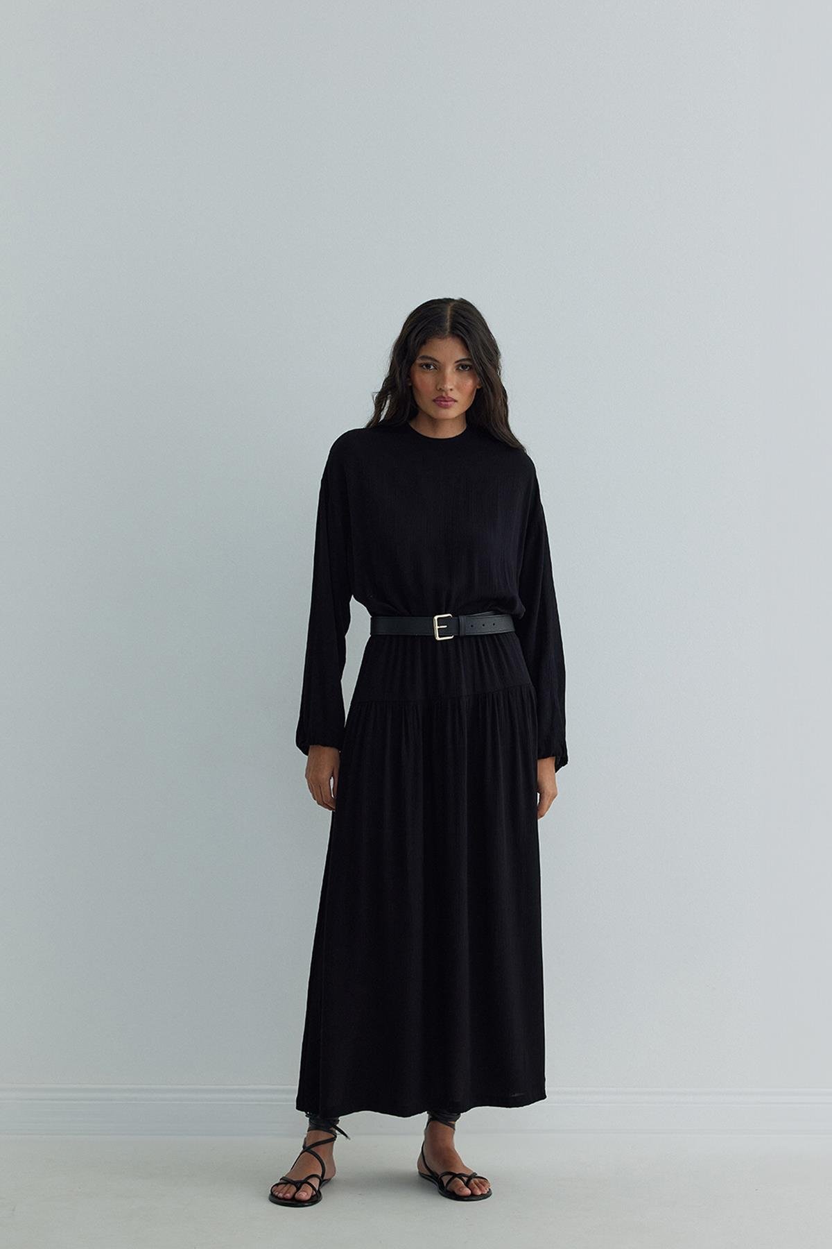 Zarif dökümlü, uzun kollu, %100 pamuk Mell Beli Lastikli Elbise. Görünümünü Mini Moon Çanta ile tamamla.