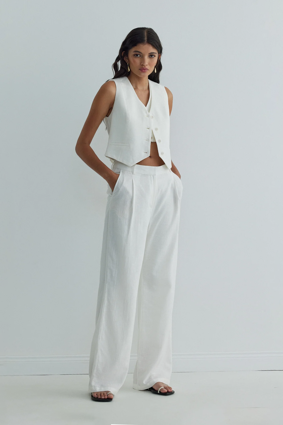 The Gabriel Linen Trousers, inspired by the Rhodes Linen Double Pleated Trousers pattern, feature a pleated design and a welt pocket at the back for natural elegance.